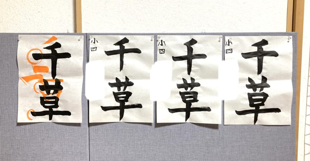 写真の一番右の作品は二文字とも長い横画の位置がバシッと決まりました。たっぷりした線でのびのび書けましたね。