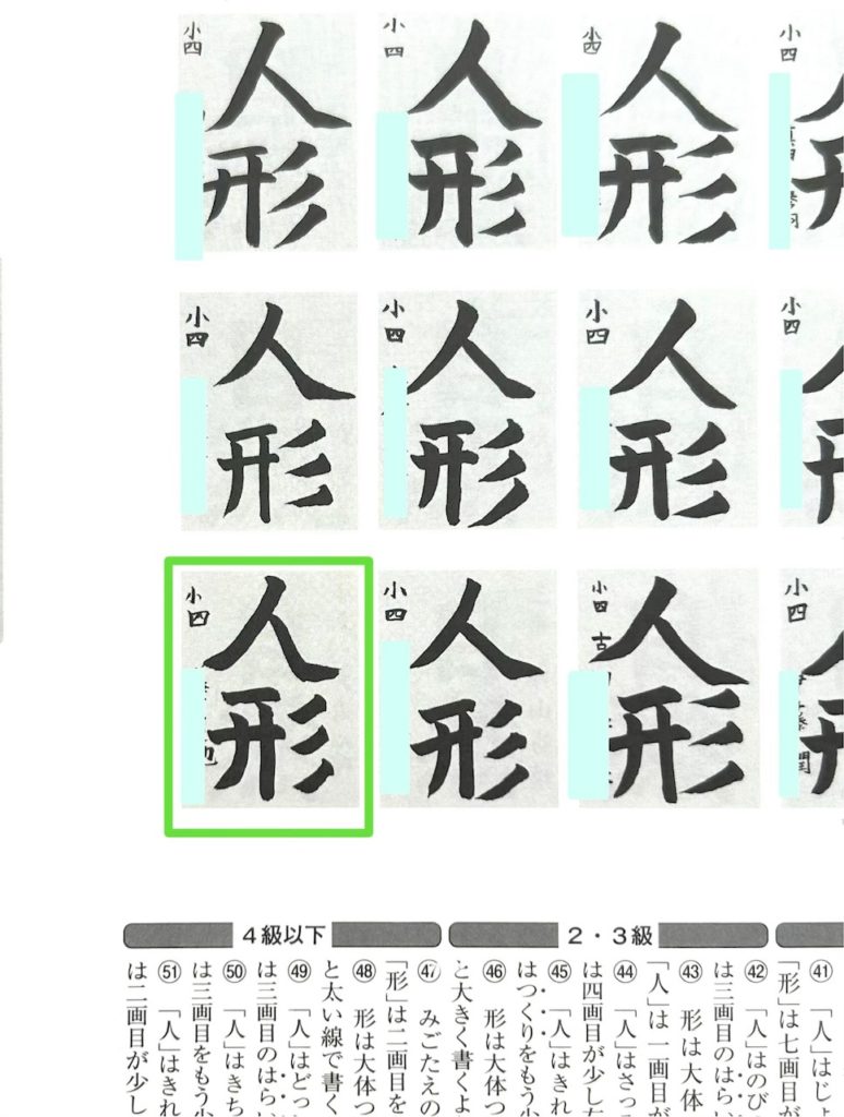 お手本に指を当てて一画一画の長さを図りながら